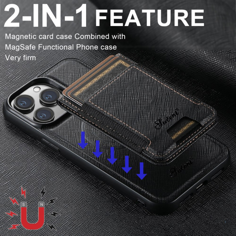 Discover the SUTENI H17 case for iPhone 12 / 12 Pro, combining style and functionality. Made from quality PU leather and soft TPU, it offers durable protection with a stylish textured design. Its detachable magnetic card holder holds 3-4 cards and acts as a stand for hands-free use. Compatible with MagSafe wireless charging and magnetic car mounts.