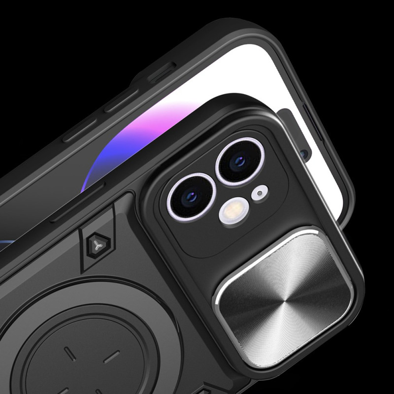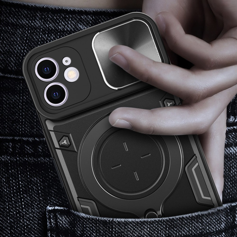 Discover our innovative protective case for iPhone 12. Featuring a sliding cover for the camera and a 360° rotating support, this case combines functionality and security. Made from TPU and plastic, it offers optimum protection against bumps and scratches.