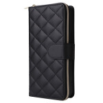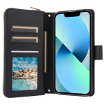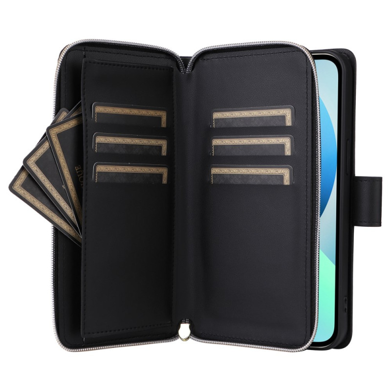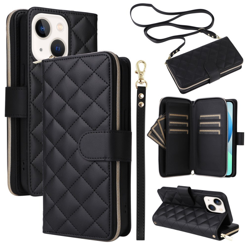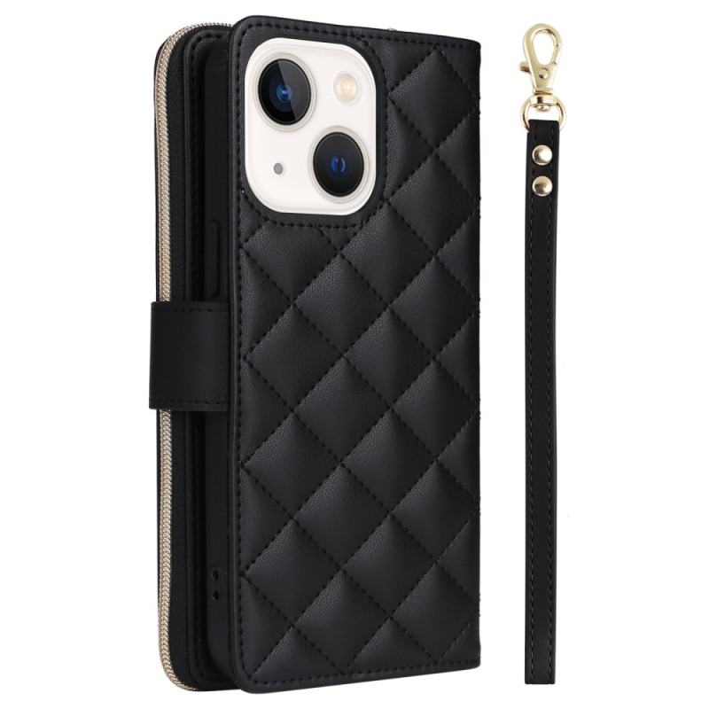 Elegant wallet case in PU leather with zip for iPhone 13 mini. Refined quilted design, multiple compartments for cards and cash, additional zipped pocket. Integrated stand function and adjustable shoulder strap for easy carrying.