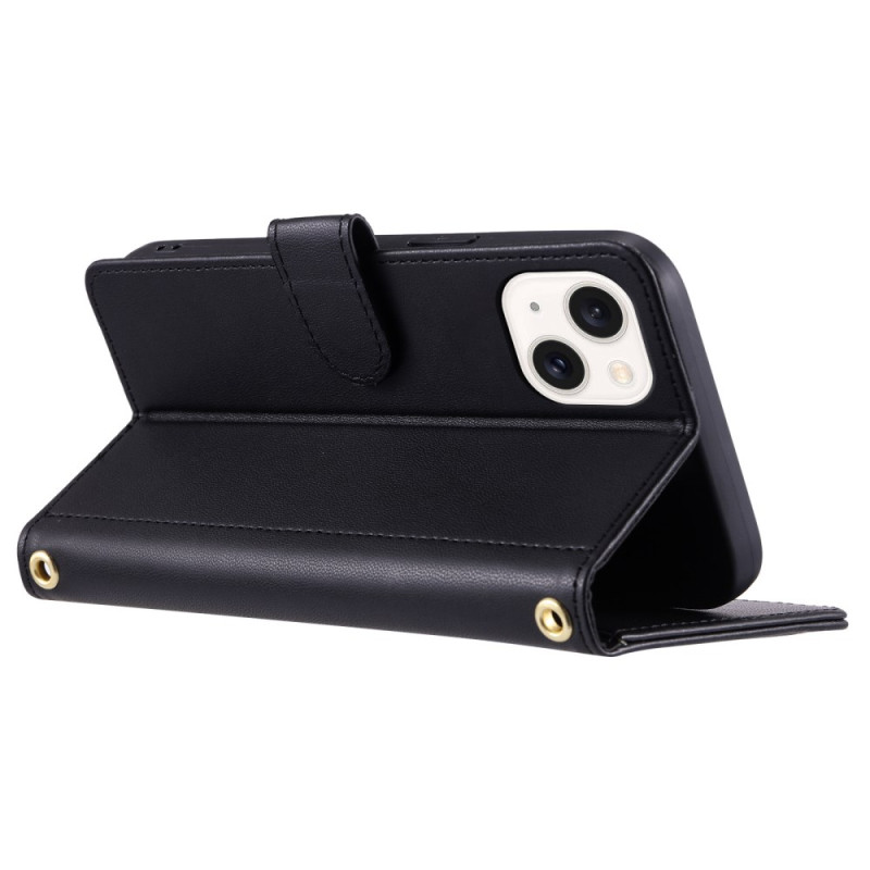 Stylish wallet case for iPhone 13 Mini with adjustable shoulder strap, pockets for cards and coins, and integrated stand function. Refined padded design offers complete protection while keeping your essentials close to hand.