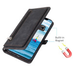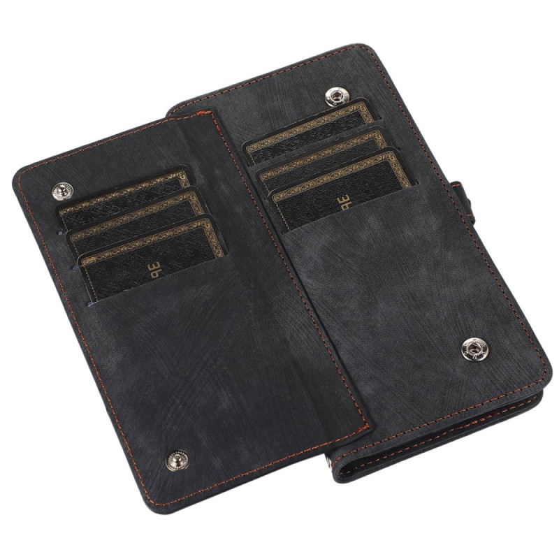 Multifunctional PU leather wallet case for iPhone 13 mini. Features 9 card slots, secure zipped pocket and integrated stand. Comes with a detachable hand strap for practical everyday carrying.