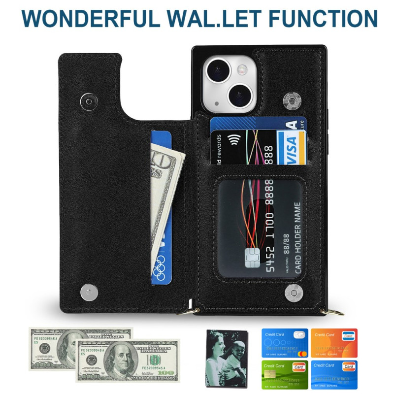 Multifunction case for iPhone 13 Mini with RFID protection, foldable stand and long shoulder strap. With card slots and a secure magnetic closure, it protects your phone while keeping your belongings close to hand.
