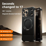 Stylish magnetic case for iPhone 13 Pro Max with integrated multi-functional stand. MagSafe compatible and wireless charging. Borderless design with reinforced corner protection. Easy sliding installation.