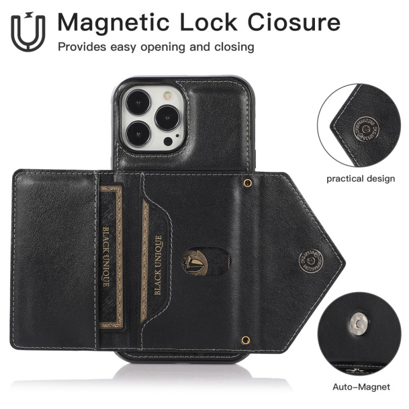 Elegant multifunction case for iPhone 13 Pro Max combining premium protection and practicality. Includes a magnetic card holder, a hands-free viewing stand and an adjustable 1.5m detachable shoulder strap for easy everyday use.
