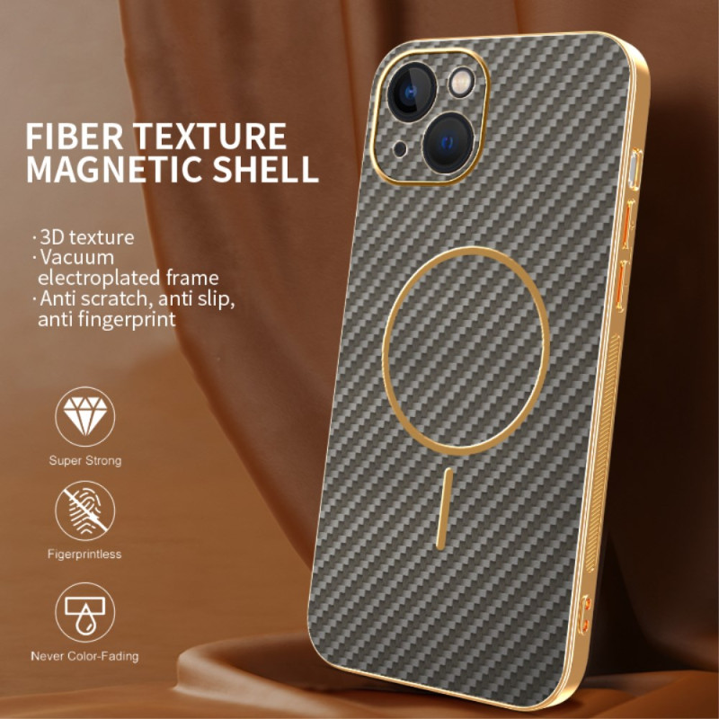 Discover our elegant and durable protective case for iPhone 13. Made from flexible TPU with an electroplated finish and carbon fibre texture, it offers excellent shock absorption and refined aesthetics. The case resists fingerprints, protects the camera and screen, and provides a secure grip.