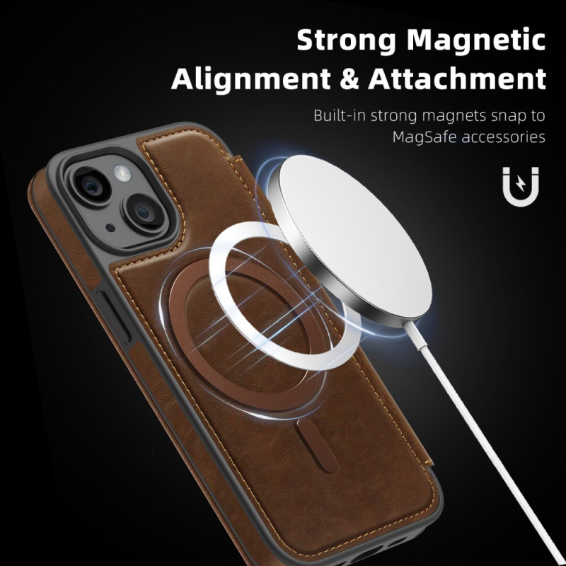 Discover our MagSafe-compatible iPhone 13 case with integrated card holder and RFID blocking technology. Made from high-quality TPU and PU leather, it offers durable, stylish protection for your device. Its card slots and raised edges make it practical and secure for everyday use.