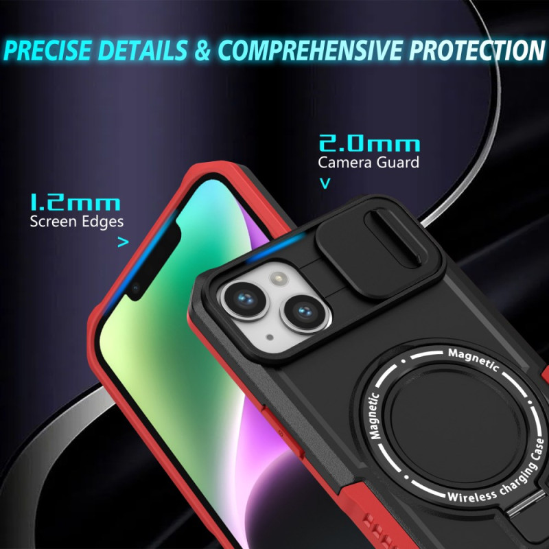 Discover our innovative case for iPhone 14 Plus, combining maximum protection with practical features. With a sliding cover for the camera, an integrated stand and MagSafe wireless charging, this case offers military-grade protection while preserving the aesthetics of your device.