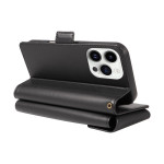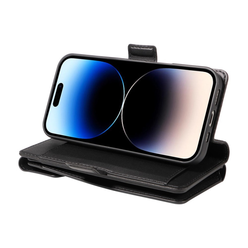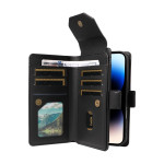 Multifunctional PU leather wallet case for iPhone 14 Pro Max. With multiple card slots, note compartments, integrated stand function and removable hand strap. Secure magnetic closure and precise cutouts for easy access.