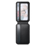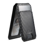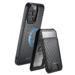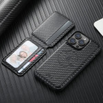Magnetic 2-in-1 case in carbon fibre textured PU leather and TPU for iPhone 14 Pro Max. Detachable card holder with 3-4 slots, stand function and MagSafe compatibility. Elegant and practical protection for your everyday life.