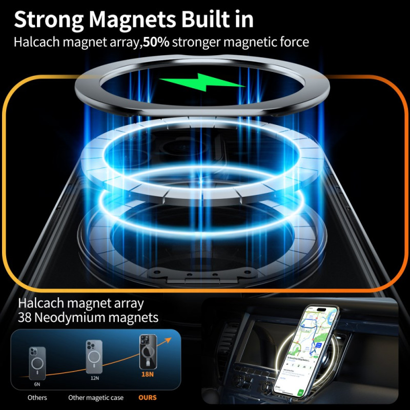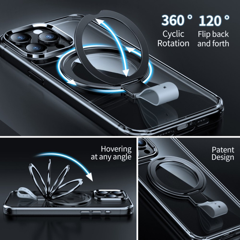 High-quality transparent PC case for iPhone 14 Pro Max. Integrated 360° rotating magnetic mount for optimal hands-free viewing. MagSafe compatible with 38 neodymium magnets for superior magnetic strength. Certified military grade drop protection.