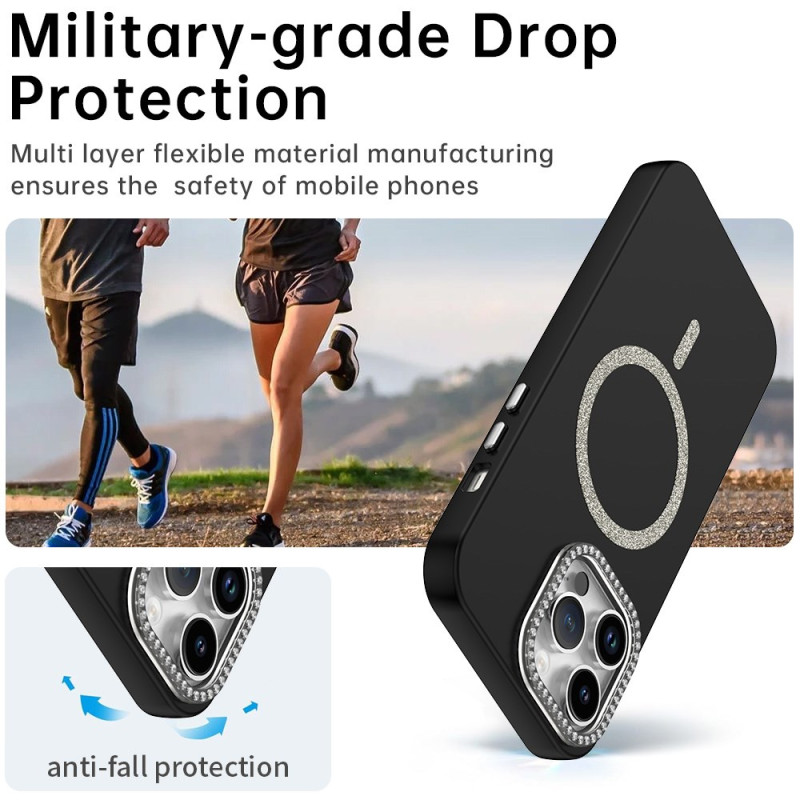 Discover our elegant case for iPhone 14 Pro, MagSafe compatible. Combining style and protection, it features a lens frame adorned with sparkling rhinestones and a glittery design. Made from high-quality TPU and PET, this slim, lightweight case offers long-lasting protection against scratches and bumps.