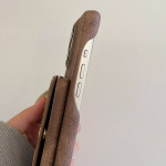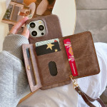 High-quality textured PU leather case for iPhone 14 Pro. Practical tri-fold design with card slots, integrated stand function and make-up mirror. Camera protection and leather hand strap for comfortable, secure everyday use.