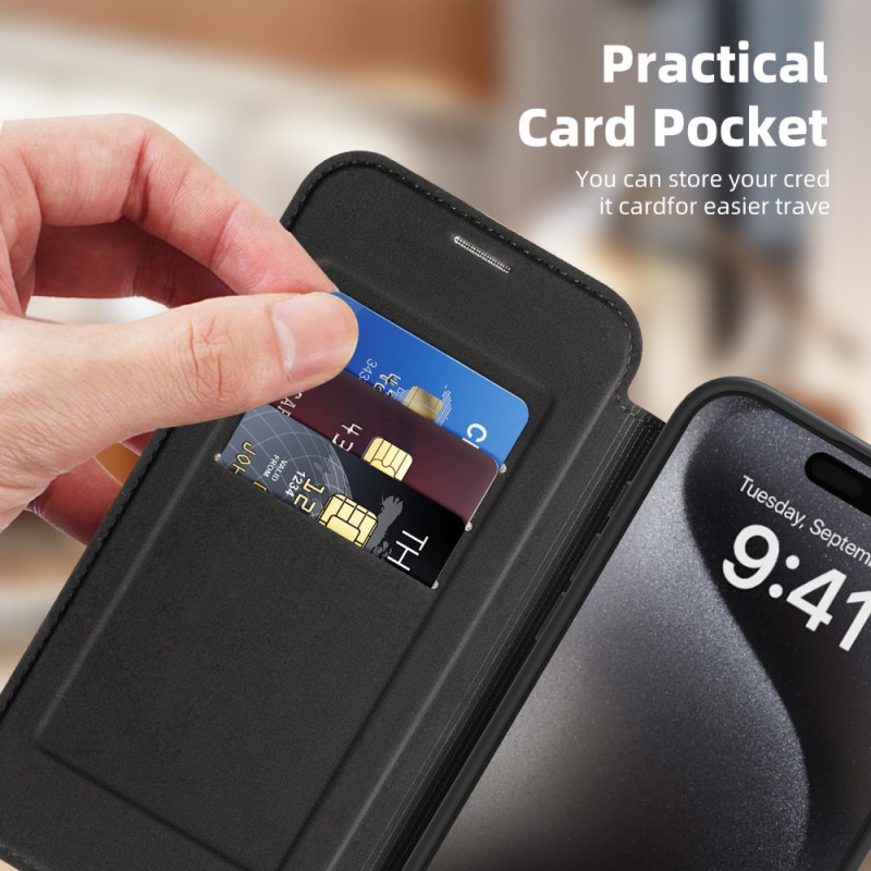 Discover our stylish and functional case for iPhone 15 Pro Max. MagSafe compatibility, integrated card holder and RFID blocking technology for optimum protection. Made from high-quality TPU and PU leather, it offers durability and style while protecting your device from scratches and bumps.
