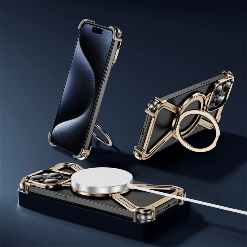 Discover our innovative case for iPhone 15 Pro. Made from hard-wearing metal, it offers exceptional protection against knocks and drops. Its 360° rotating holder makes hands-free viewing easy. Compatible with magnetic mounts and MagSafe charging, this case combines functionality and style for your device.