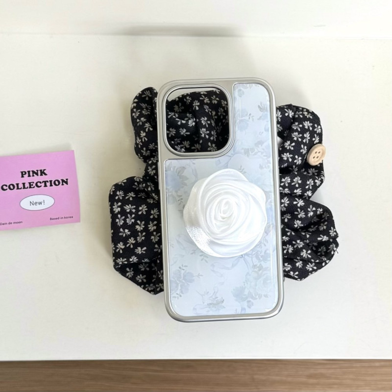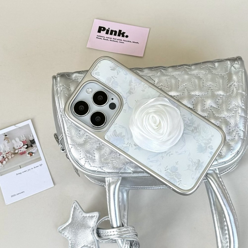 Discover our elegant case for iPhone 15 Pro, combining style and protection. Its soft blue floral design under a glossy epoxy coating, embellished with a 3D satin ribbon camellia charm, adds a romantic and refined touch. The silver electroplated frame not only enhances its aesthetic appeal, but also its durability. Made from high-quality hard plastic, this case offers excellent shock absorption and long-lasting protection.