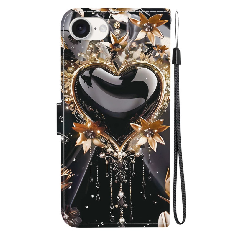 Elegant wallet case with black and gold heart motif for iPhone 17E / 16E. Sophisticated design with integrated folding stand, card slots and matching hand strap. Complete magnetic protection for everyday style and functionality.