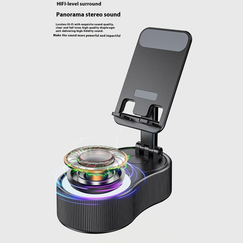 Scoprite questo supporto multifunzione 3 in 1: altoparlante Bluetooth di alta qualità, batteria esterna da 2000 mAh e supporto per telefono regolabile a 360°. Con illuminazione d'atmosfera integrata per creare un'atmosfera unica. Connessione stabile fino a 10 metri.