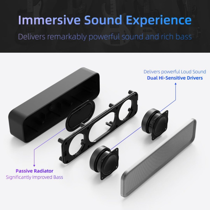 Questa soundbar USB offre un audio potente grazie a due driver da 40 mm, ciascuno dei quali eroga 3 W, integrati da un radiatore passivo per aumentare i bassi. Le sue dimensioni compatte la rendono facile da installare su una scrivania senza occupare troppo spazio, migliorando al contempo l'esperienza sonora per la musica, i film o le chiama in videoconferenza. L'alimentazione USB garantisce un'installazione immediata senza driver o alimentazione esterna. Il suo elegante design nero si integra armoniosamente in qualsiasi spazio di lavoro o interno moderno.