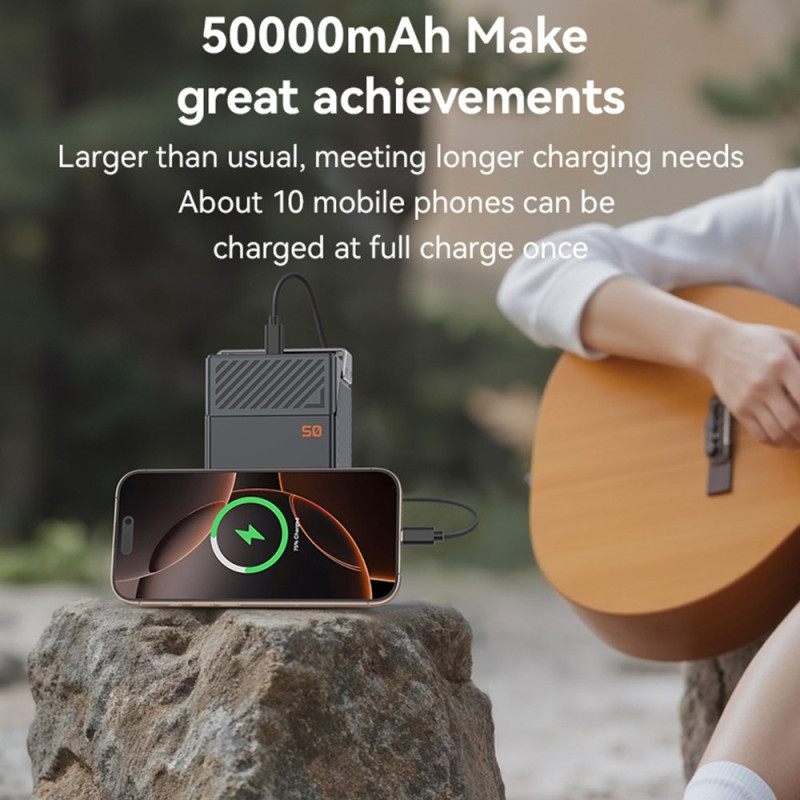 Autonomia senza precedenti e capacità di ricarica condivisa definiscono questa batteria esterna da 50000 mAh, progettata per gruppi e lunghi periodi. Dispone di sei uscite (3 Type-C, 3 USB-A), che consentono di caricare contemporaneamente un gran numero di dispositivi. La potenza di ricarica rapida raggiunge i 22,5 W (tramite USB-A2), garantendo un'alimentazione efficiente a tutti i dispositivi. La robusta struttura in lega di zinco e PC/ABS garantisce la massima durata e resistenza. Il display digitale consente di monitorare con precisione la potenza residua. Il dispositivo è certificato CE e ROHS, per garantire la conformità agli standard europei.