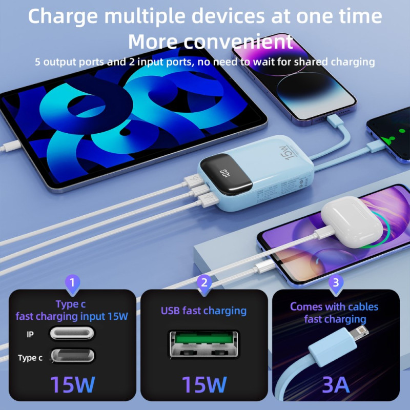 Il conflitto tra la ricarica via cavo e il comfort nella mano è risolto dall'ingegneria ergonomica di questa unità ROISKIN. Questa batteria esterna da 10000 mAh integra due cavi di ricarica (Type-C e Lightning) progettati per essere distribuiti a 180 gradi, senza mai ostacolare l'uso del dispositivo. Con cinque uscite disponibili, è in grado di caricare diversi dispositivi contemporaneamente. Un ampio e chiaro display digitale consente di monitorare facilmente la durata della batteria. Il dispositivo è protetto da nove livelli di protezione smart ed è conforme agli standard europei CE-RoHS.