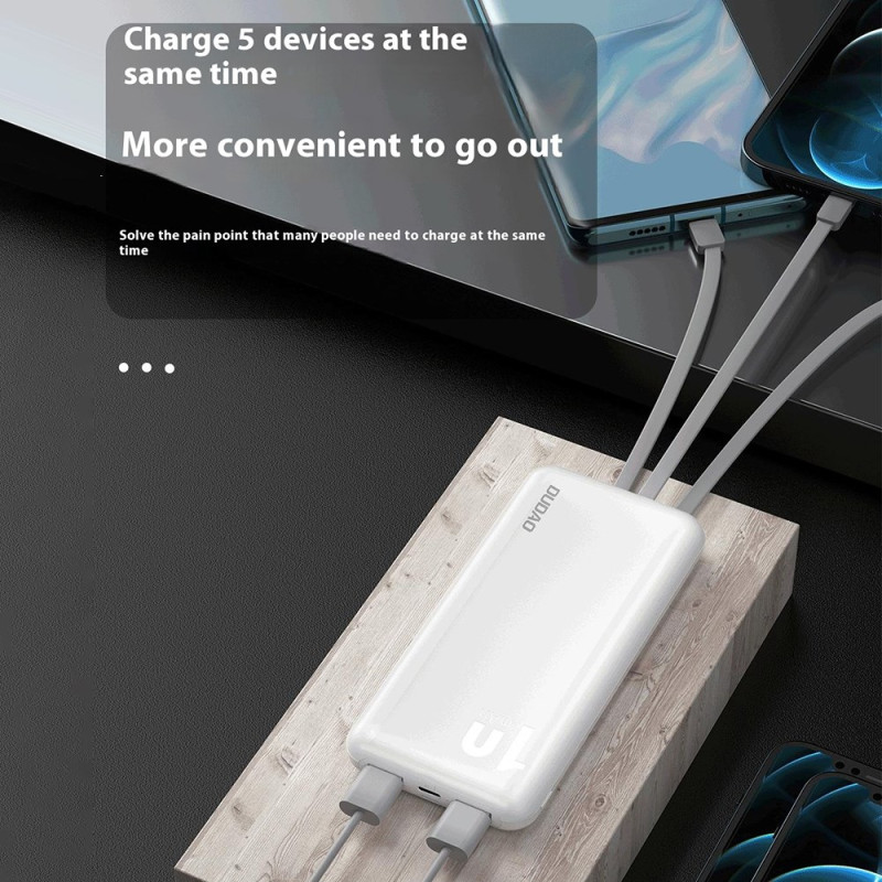 Questa batteria esterna DUDAO da 20.000 mAh offre una lunga durata e dispone di quattro cavi integrati, tre per l'uscita e uno per l'ingresso. Può ricaricare più dispositivi contemporaneamente, il che la rende ideale per i viaggi o per l'uso condiviso. Le sue dimensioni compatte la rendono facile da tenere in mano e da trasportare. Il display digitale a quattro livelli consente di controllare facilmente l'autonomia residua, in modo da poter pianificare in anticipo la ricarica. Una soluzione pratica e pronta all'uso, senza bisogno di cavi aggiuntivi.