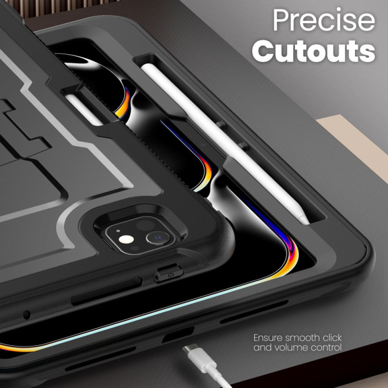 Proteggete il tuo iPad Pro 11 (2025) / 11 (2024) con la nostra robusta e versatile custodia. Realizzata con materiali resistenti , offre un'eccellente resistenza ai graffi e agli urti. Il supporto integrato consente una comoda visione mani libere , mentre la cover per lo stilo e i tagli precisi assicurano praticità e piena funzionalità.