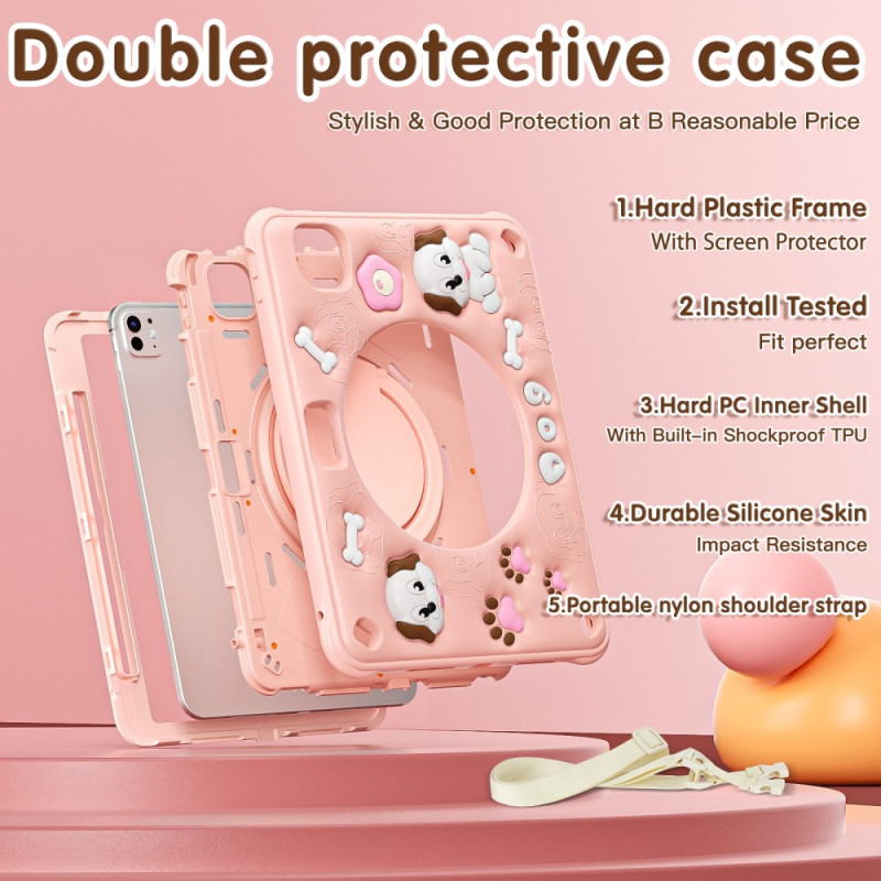 Scoprite la nostra adorabile e funzionale cover per iPad Pro 11 (2025) / 11 (2024). Con il suo simpatico motivo a cane, il supporto integrato e la tracolla, unisce stile e praticità. La protezione multistrato e gli angoli rinforzati garantiscono una sicurezza ottimale per il tuo tablet. Ideale per grandi e piccini, questa versatile cover può essere portata ovunque.