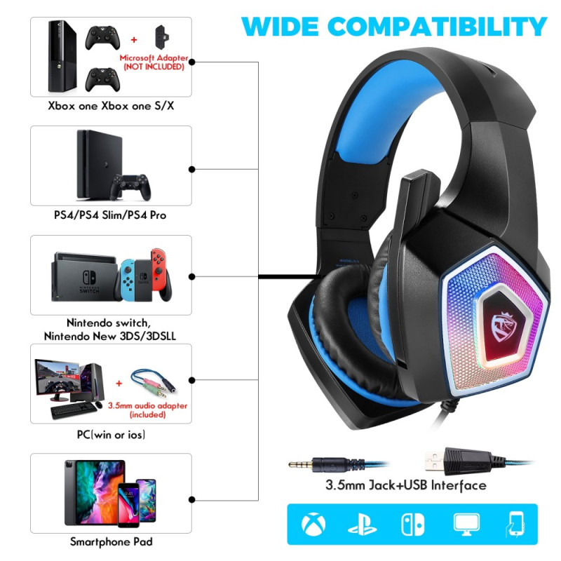 Le cuffie da gioco KOTION EACH V-1 sono dotate di illuminazione RGB dinamica per migliorare l'immersione e aggiungere una dimensione visiva sorprendente a ogni sessione di gioco. I suoi driver da 40 mm offrono una risposta in frequenza da 20 a 20.000 Hz, garantendo un suono chiaro, ricco e preciso per una migliore percezione dei dettagli del gioco. Progettate per il massimo comfort, combinano una struttura leggera con cuscinetti in pelle traspiranti. La compatibilità estesa è assicurata da un adattatore incluso, mentre il microfono integrato garantisce comunicazioni chiare.
