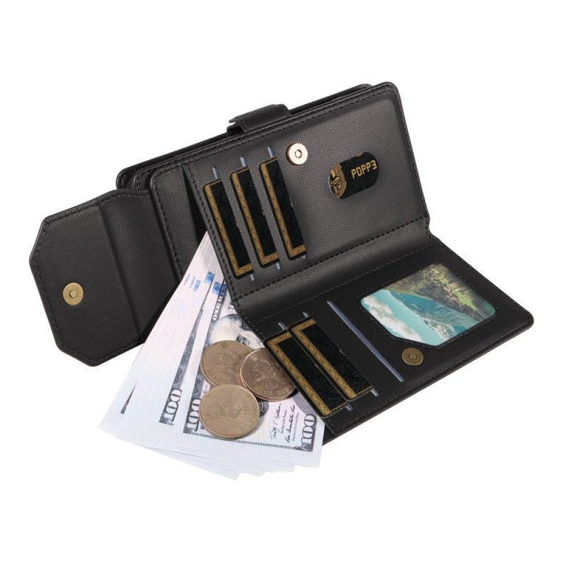 Custodia multifunzione in pelle PU per iPhone 14 Pro Max. Con più scomparti per carte, scomparti per banconote, funzione stand integrata e cinturino rimovibile. Chiusura magnetica sicura e tagli precisi per un facile accesso.