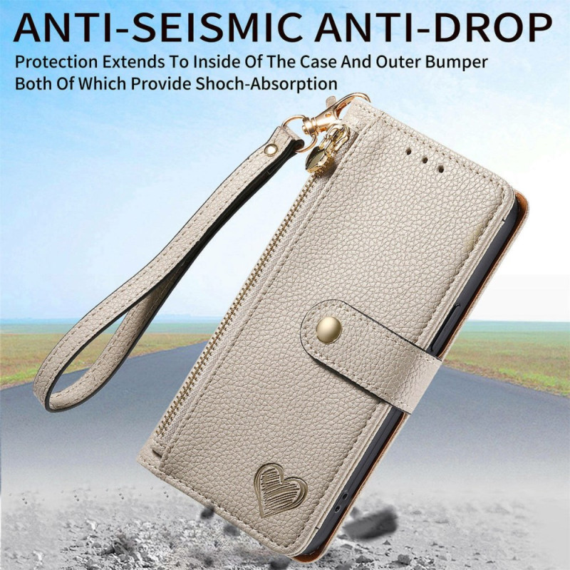 Proteggete il tuo smartphone con stile grazie a questa cover multifunzione. Dotata di tecnologia anti-RFID, protegge le carte di credito e offre una pratica cover con tasca con zip e scomparti integrati. Il supporto mani libere e la cinghia rimovibile la rendono comoda e pratica per l'uso quotidiano.