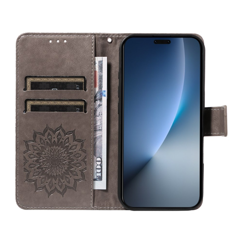 Elegante cover a portafoglio in pregiata pelle PU con design a girasole in rilievo 3D. Include 2 scomparti per carte, scomparto laterale, funzione vivavoce e pratico laccetto. Protezione robusta con cover interno in TPU opaco.