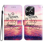Elegante cover a portafoglio con motivo ispiratore "Never Stop Dreaming". Design a patta con supporto multiangolare, chiusura magnetica sicura, 3 scomparti per carte di credito e cinturino staccabile. Protezione completa e stile raffinato per il tuo Honor X5c Plus.
