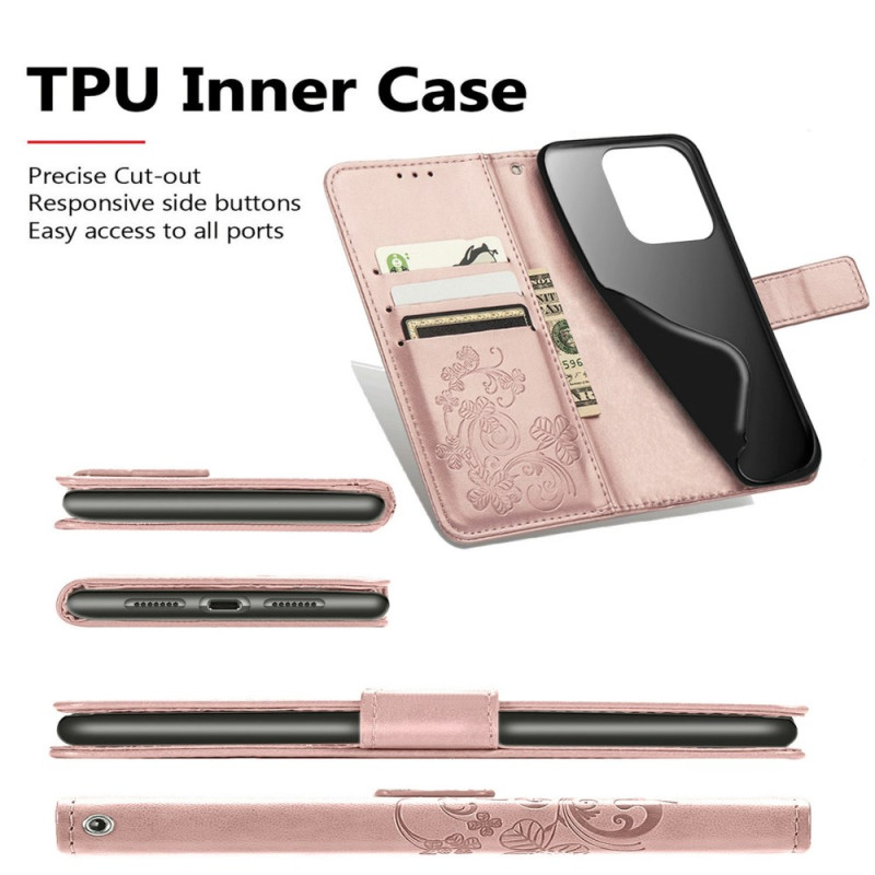 Proteggete il tuo Honor X5c Plus 4G con stile grazie a questa cover a portafoglio in pelle PU premium. Design raffinato con motivo a trifoglio, più scomparti per carte, tasca per contanti e funzione di supporto pieghevole per l'uso a mani libere.