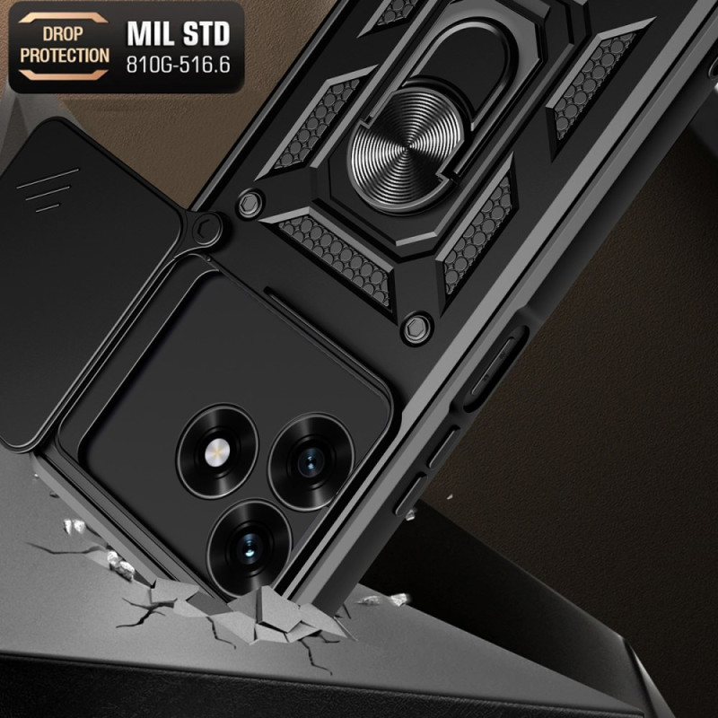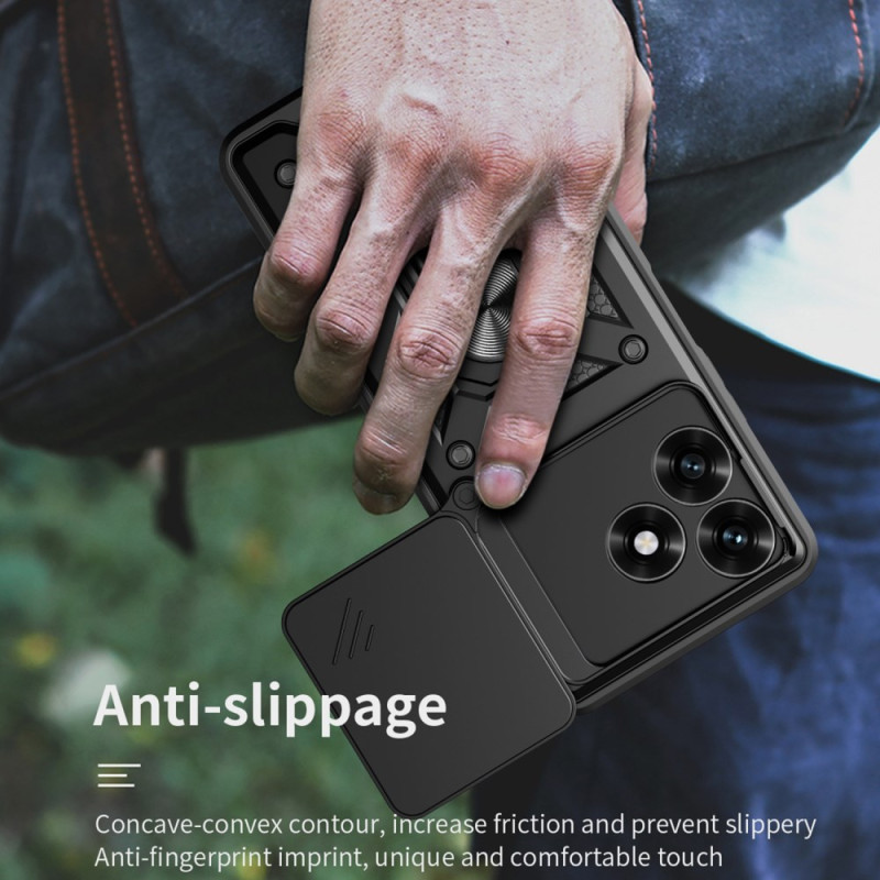 Scoprite questa robusta cover con supporto rotante integrato e protezione scorrevole per la fotocamera. Dotata di resistenza agli urti di livello militare, offre una protezione ottimale e consente un comodo utilizzo a mani libere. Compatibile con i supporti magnetici per auto.