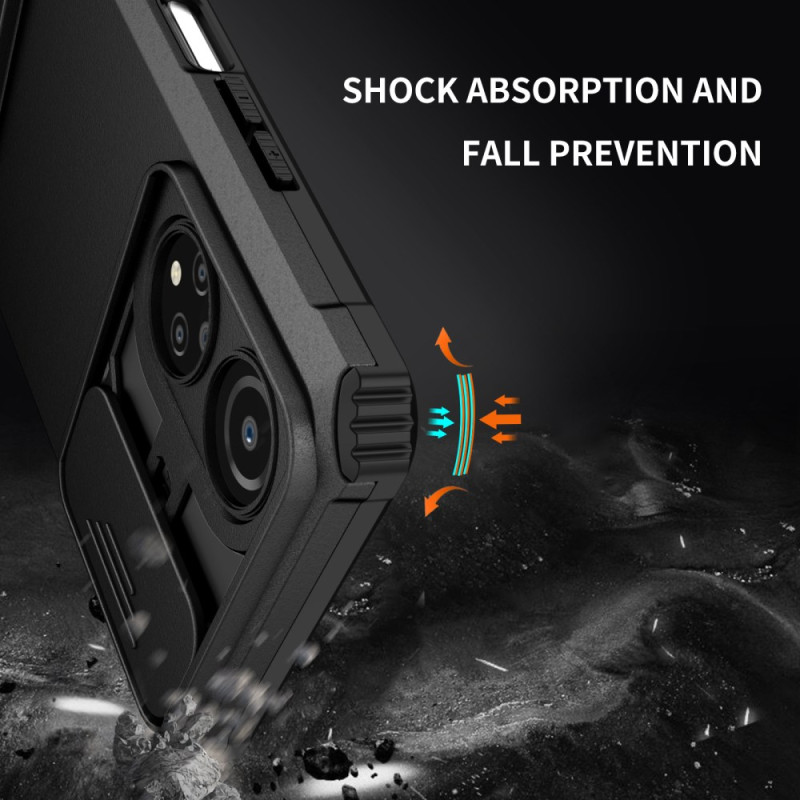 Proteggete il tuo Honor X7 con questa innovativa cover dotata di custodia scorrevole per la fotocamera, cavalletto integrato e doppia protezione rinforzata. Design anti-caduta con angoli rinforzati per la massima sicurezza quotidiana.