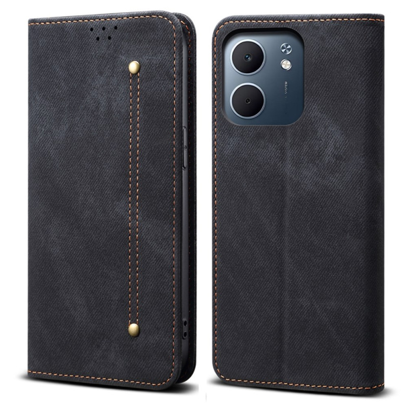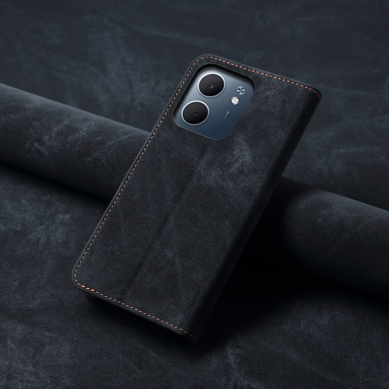 Questa elegante cover per Oppo A5X 4G unisce lo stile retrò alla praticità. Realizzata in pelle PU di prima qualità con una texture in vero denim, offre una protezione completa e incorpora 2 slot per carte e una tasca laterale.