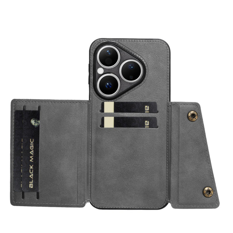 Custodia multifunzione per Huawei Pura 80 che unisce stile e praticità. Dispone di portacarte integrati, di un supporto regolabile per la visione mani libere e di una doppia chiusura a scatto.