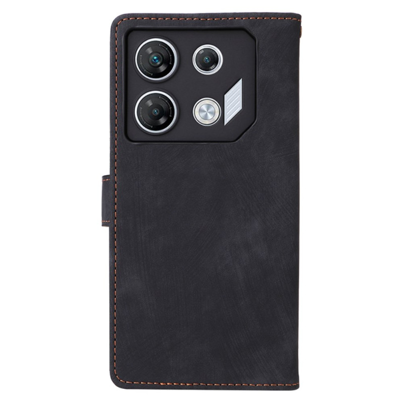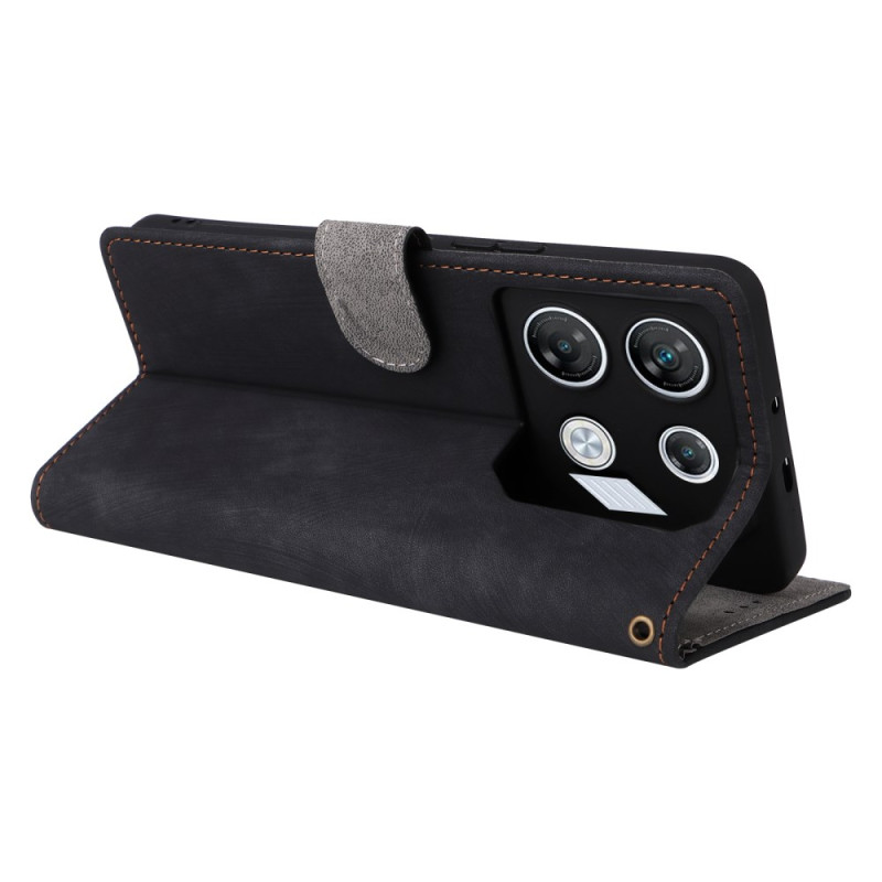 Elegante cover a portafoglio per Infinix GT 10 Pro 5G con tecnologia di blocco RFID. Dispone di 3 slot per carte, supporto per mani libere e chiusura magnetica sicura. Include un pratico laccetto per facilitare il trasporto.