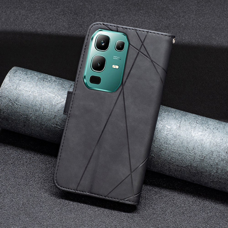 Elegante cover a portafoglio per Infinix Note 50X 5G con supporto regolabile e moderno design geometrico. Combina protezione e funzionalità complete con 3 scomparti per carte e note. Chiusura magnetica sicura.