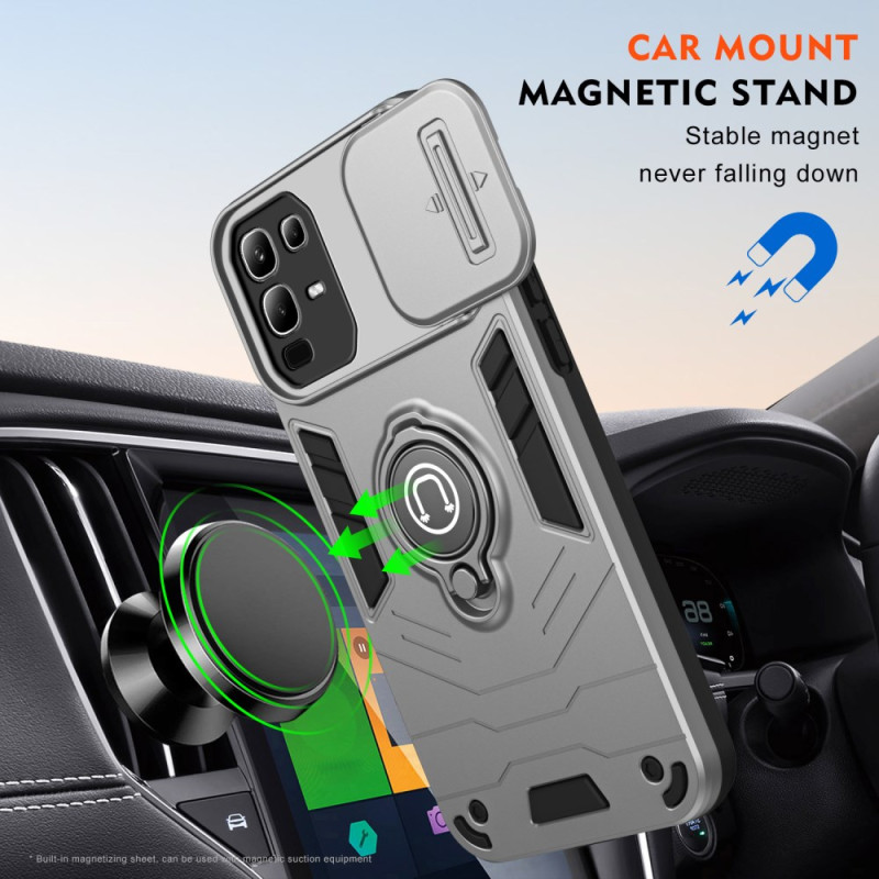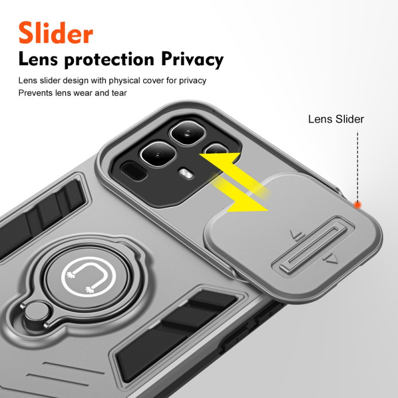 Proteggete il tuo Infinix Note 50X 5G con questa innovativa cover dotata di protezione scorrevole per la fotocamera, anello di supporto rotante e cavalletto integrato. Compatibile con i supporti magnetici per un utilizzo ottimale in auto.