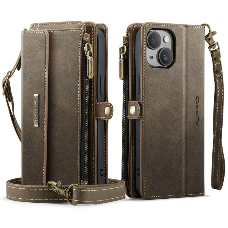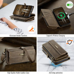 Custodia multifunzione per iPhone 13 Mini con tecnologia anti-RFID. Dispone di 9 scomparti per carte, tasca con cerniera e supporto per le mani. Design versatile per essere portata a tracolla o come pochette.