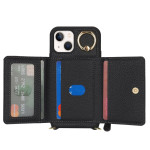 Custodia multifunzione in pelle PU e TPU per iPhone 13 Mini. Tasca integrata con cerniera per gli oggetti essenziali, slot per carte di credito e anello di supporto rotante. Viene fornita con una tracolla staccabile per un pratico trasporto quotidiano.