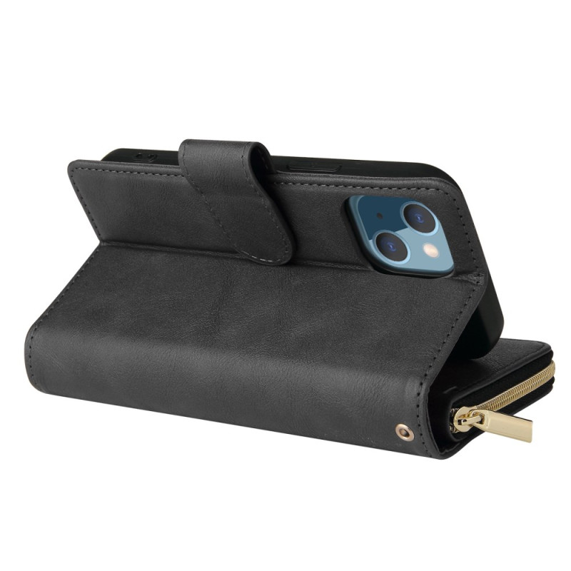 Custodia multifunzione per iPhone 13 Mini con 9 scomparti per carte, tasca con cerniera, chiusura magnetica sicura e supporto per la visualizzazione. Dispone di un pratico laccetto per facilitare il trasporto quotidiano.
