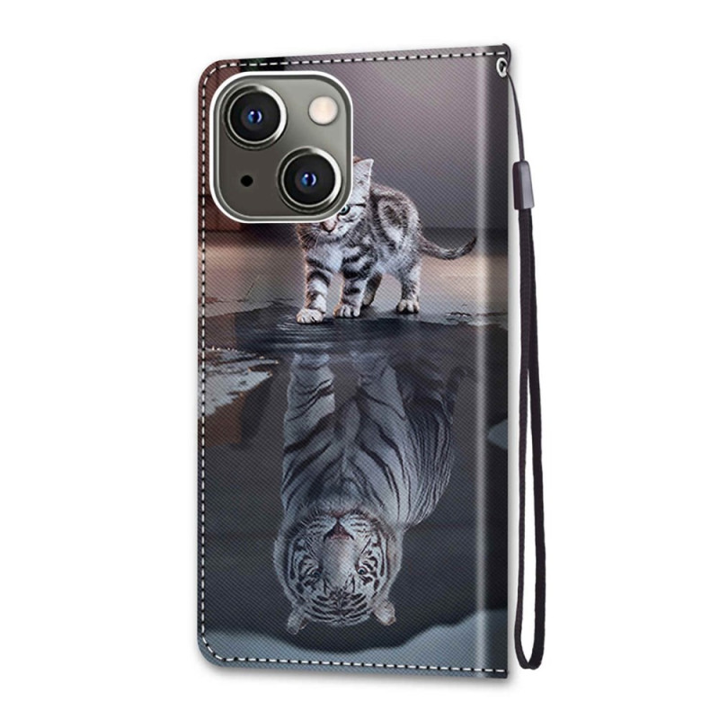 Proteggete il tuo iPhone 13 Mini con stile grazie a questa cover a portafoglio con un caratteristico motivo a gatto e tigre. Dotata di un pratico supporto pieghevole, di slot per carte di credito integrati e di un laccetto per la mano, unisce eleganza e funzionalità.