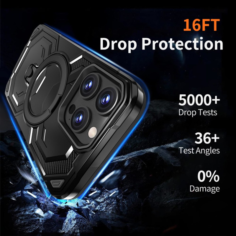 Proteggete il tuo iPhone 13 Pro Max con questa cover ibrida in PC + TPU ultra resistente. Dotata di un anello magnetico multifunzione che funge da cavalletto e compatibile con i caricabatterie wireless, unisce la massima protezione alla praticità quotidiana.