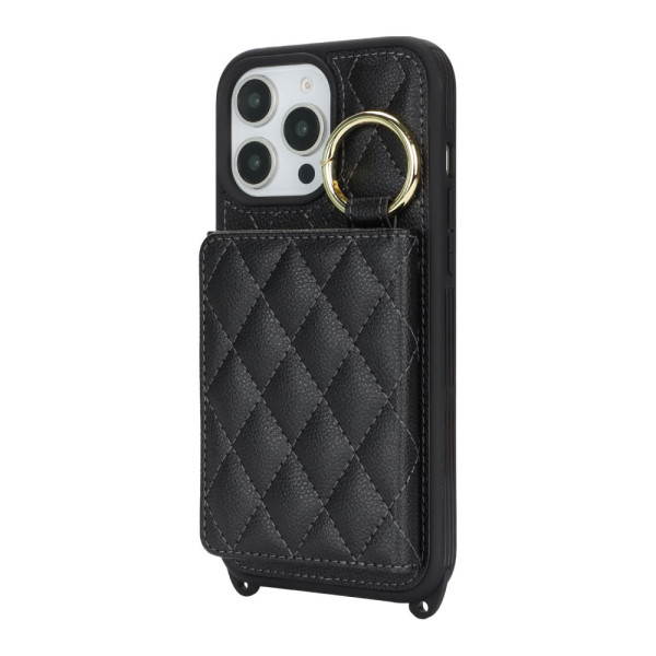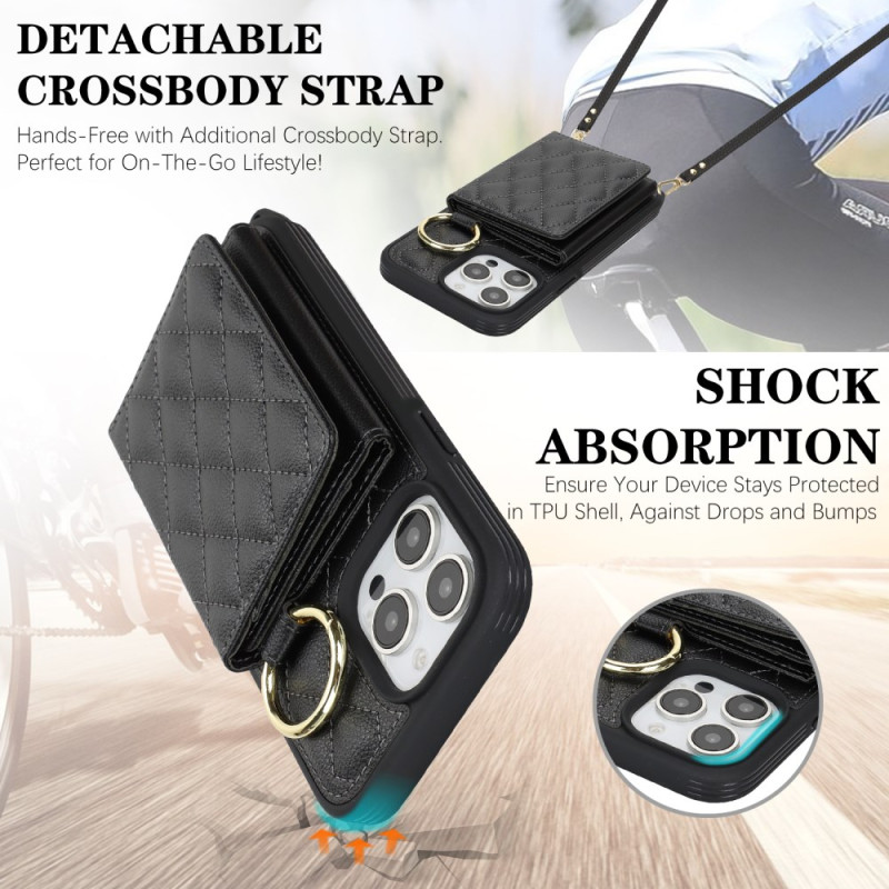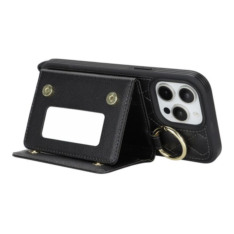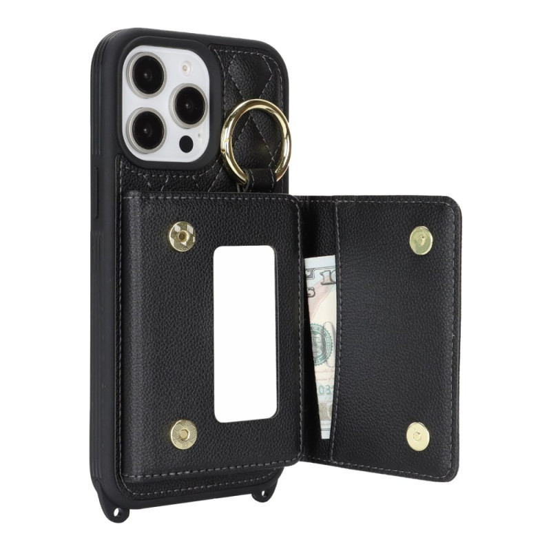 Custodia multifunzione con cordino regolabile, 3 slot per carte, specchio integrato e protezione RFID. Design elegante con motivo a griglia e supporto pieghevole per un utilizzo ottimale a mani libere.