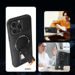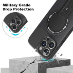 Robusta protezione per iPhone 13 Pro Max con struttura in fibra di carbonio e supporto integrato. Il design ibrido resistente agli urti offre protezione di livello militare, rivestimento antigraffio e compatibilità con il supporto magnetico per auto.
