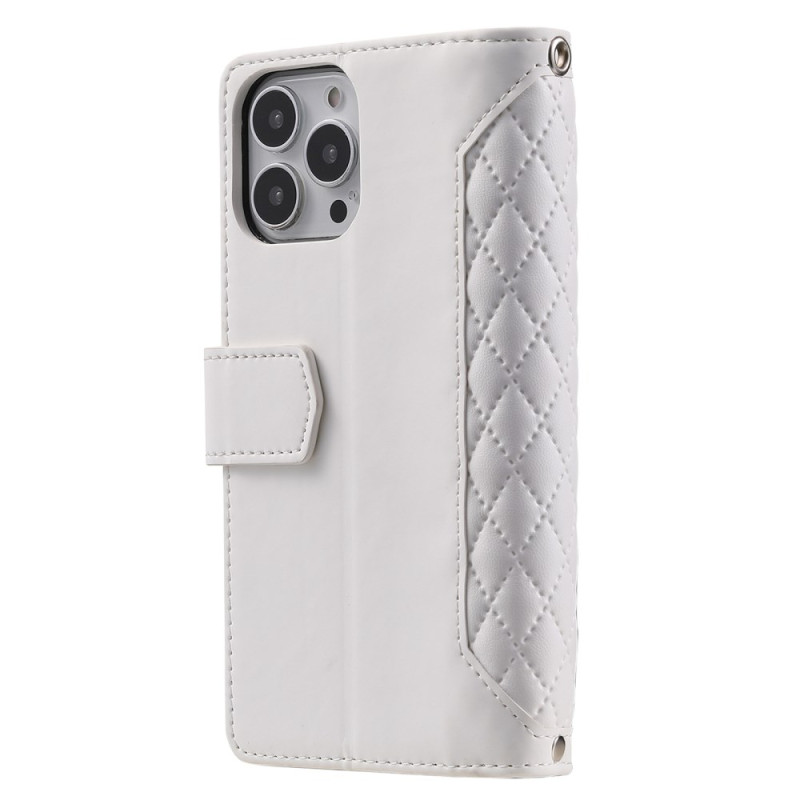 Scoprite questa elegante cover a portafoglio per iPhone 13 Pro Max. Realizzata in pelle PU con finitura diamantata e cover in TPU flessibile, offre una protezione completa contro gli urti. Dispone di più scomparti per carte, una tasca con cerniera e un supporto pieghevole per una visione a mani libere.