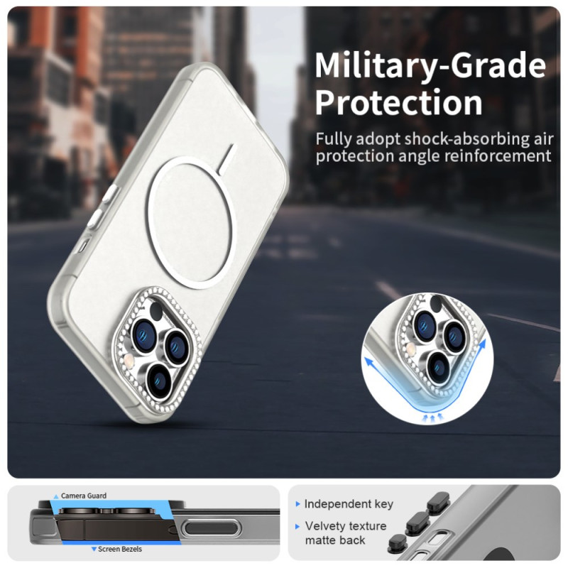 Proteggete il tuo iPhone 13 Pro con stile grazie a questa cover compatibile con MagSafe. Il suo design sottile e resistente offre una protezione ottimale contro gli urti quotidiani, mentre la cornice della lente impreziosita da strass aggiunge un tocco di glamour.