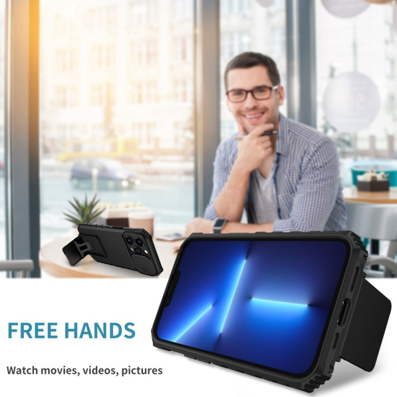 Proteggete il tuo iPhone 13 Pro con questa innovativa cover dotata di custodia scorrevole per la fotocamera e supporto verticale regolabile. Il design a doppio materiale combina flessibilità e rigidità per una protezione ottimale contro urti, graffi e polvere.